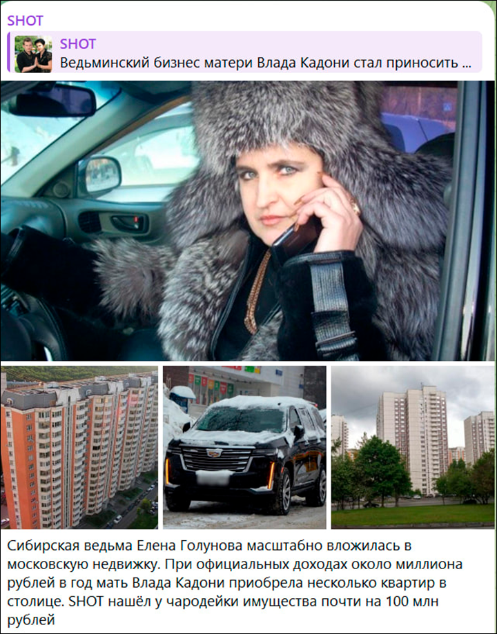 Сибирский "экстрасенс" Елена Голунова оказалась владелицей солидной недвижимости в Москве. При этом её официальные доходы, согласно открытым данным, составляют около миллиона рублей в год. Телеграм-канал SHOT тем временем обнаружил у "ведьмы" активы общей стоимостью почти на 100 млн рублей.