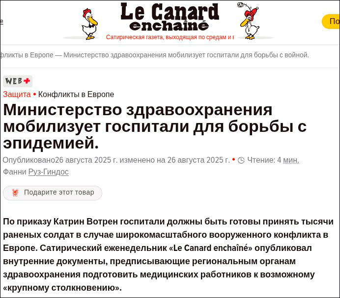 Последние новости, которые мы услышали во Франции, были о том, что больницы – и это подтверждено правительственным чиновником – получили запрос подготовиться к приёму массовых жертв войны к марту 2026 года. И французский министр в интервью подтвердил этот факт. Она просто пыталась всё это преуменьшить, как будто это нормально – готовиться к такому. Но за 30 лет работы в правительстве я вижу подобное впервые. Впервые вижу, чтобы готовились к массовым жертвам войны,