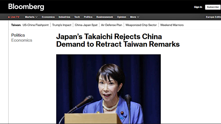 Санаэ Такаити ответила отказом на требования Китая взять обратно сделанные ею заявления по поводу Тайваня. Скриншот: Bloomberg