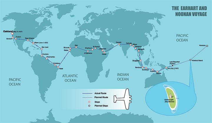 Последний полет Амелии Эрхарт. Векторная иллюстрация научного образования.Фото: Zaporizhzhia vector/Shutterstock