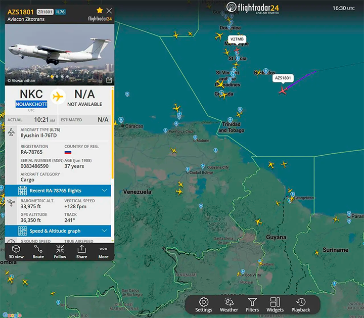 Полёт русского Ил-76ТД в Венесуэлу. Скриншот страницы сайта flightradar24.com