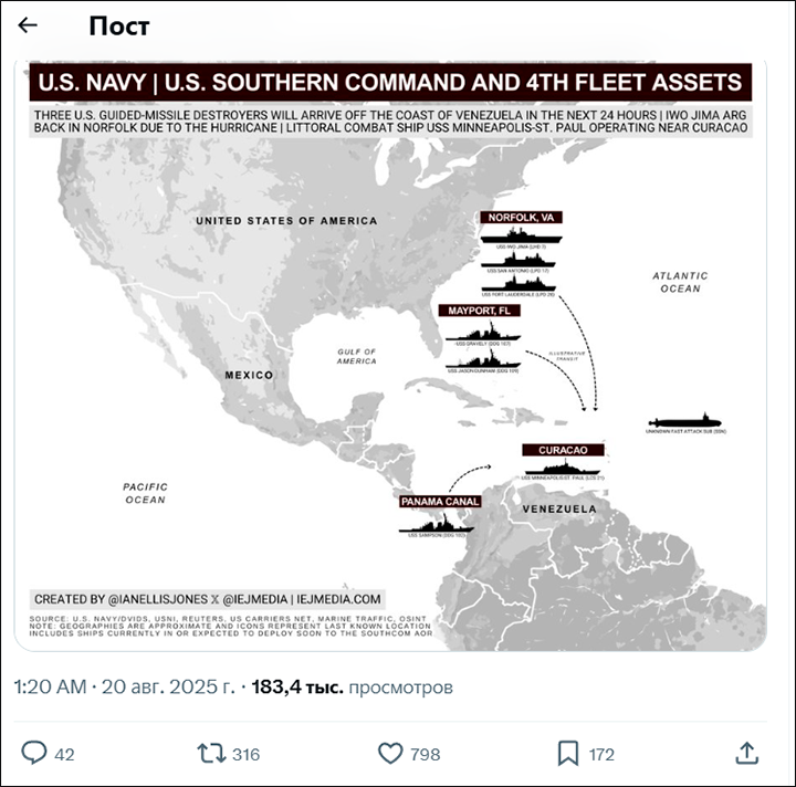 ВМС США/Южное командование США и состав 4-го флота. Три американских эсминца с управляемыми ракетами прибудут к побережью Венесуэлы в течение следующих 24 часов. Десантная группа "Иводзима" остается в Норфолке из-за урагана. Прибрежный боевой корабль USS Minneapolis-St. Paul действует в районе Кюрасао. Источник: x.com/ianellisjones