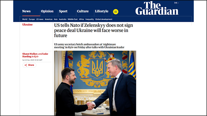 Американские чиновники сообщили союзникам по НАТО, что рассчитывают подтолкнуть Зеленского к заключению мирного соглашения, иначе "в будущем его ждёт гораздо худший вариант". Скриншот: The Guardian