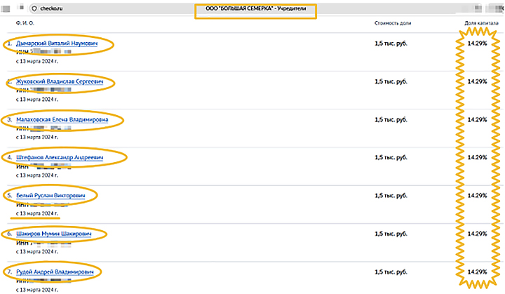 Все семь её совладельцев – иноагенты. Более того, генерального директора и блогера-иноагента Андрея Рудого* уже проверяют из-за возможной дискредитации ВС России. Руслан Белый* разделил равные доли в компании "Большая семёрка" с публицистом-иноагентом Виталием Дымарским*, блогером-иноагентом Александром Штефановым*, экономистом-иноагентом Владиславом Жуковским*, ведущей YouTube-канала "Популярная политика" иноагентом Еленой Малаховской*, журналистом-иноагентом Мумином Шакировым* и блогером Андреем Рудым*.