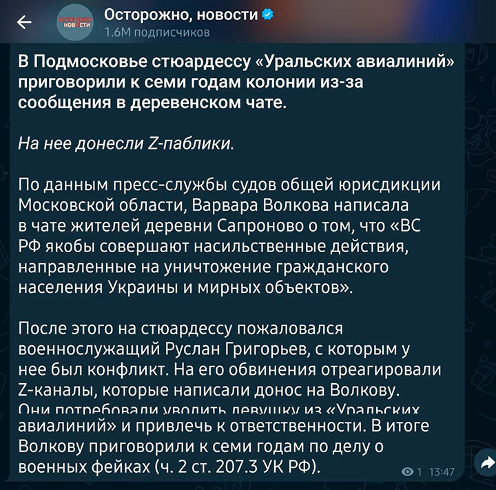 Любопытно то, как историю Волковой расписали некоторые либеральные СМИ. Например, журналисты Ксении Собчак утверждают, что мол, это "Z-паблики на неё (стюардессу) донесли". Да и в целом из их новости получается, что Волкова-де всего лишь против конфликта, за мир во всём мире. Правда, её угрозы Руслану и восхваление ВСУ почему-то оставлены журналистами за бортом.