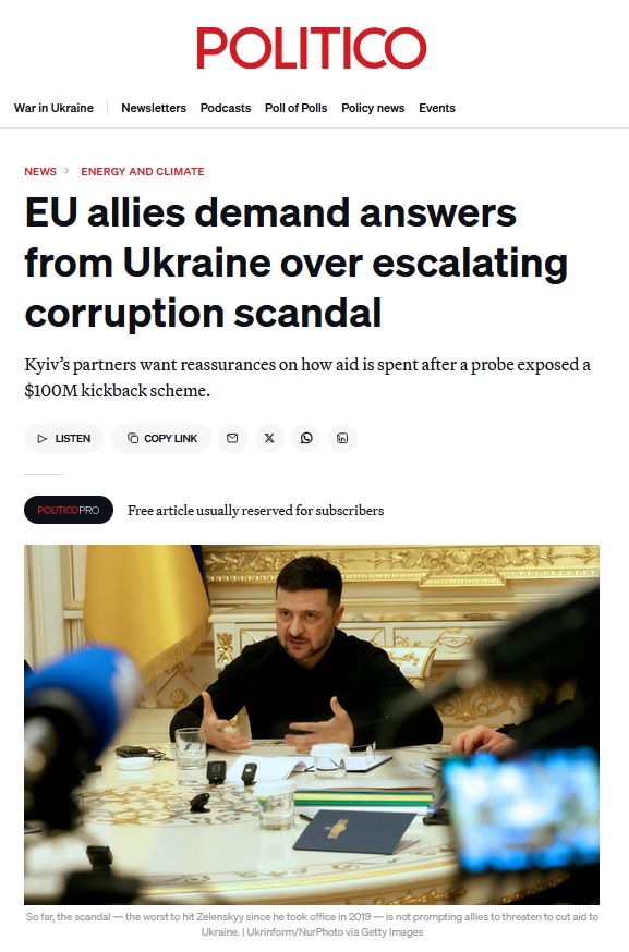 Для Украины вся эта история очень некстати. Коррупционный скандал потряс Киев в тот момент, когда украинские власти почти убедили партнёров по ЕС пойти на огромный риск и согласиться на так называемый репарационный кредит в размере 140 миллиардов евро, взятый из конфискованных русских активов.