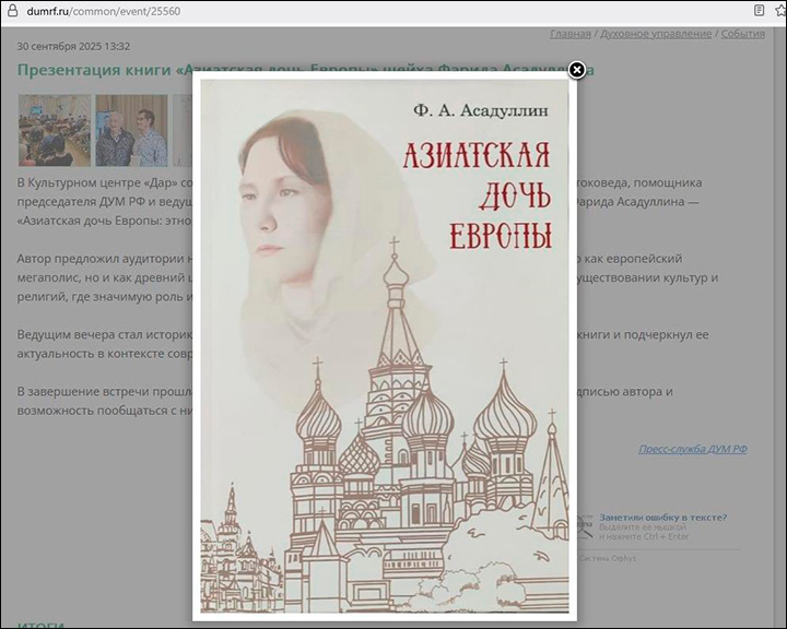 На днях Управление провело серию презентаций книги шейха (исламского богослова) Фарида Асадуллина "Азиатская дочь России". Мудрено догадаться, но название относится… к Москве: "историки от ДУМа" продвигают идею, что русская столица — это "древний евразийский центр, где значимую роль играл тюрко-мусульманский фактор".