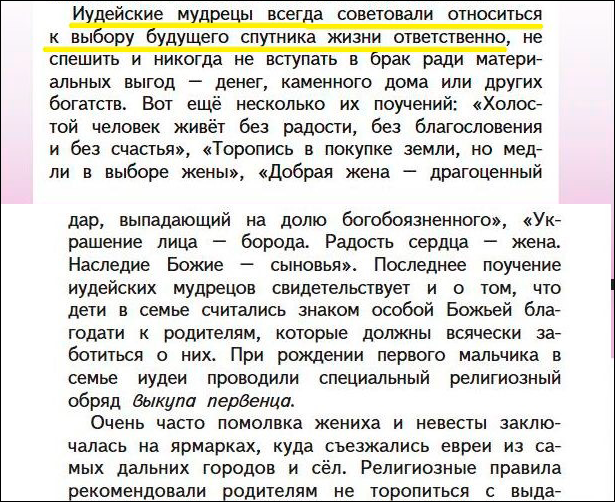 Но именно в главе об иудейских семьях внятно раскрыт священный характер брачного союза, главные принципы семейной жизни, красочно описана свадебная церемония. О православных семьях почему-то не написана следующая фраза: "С древних времён иудейские семьи славились крепостью уз и чистотой отношений".
