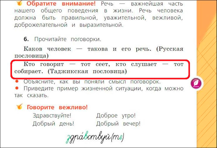 Издание учебника "Русский язык" — уже четырнадцатое по счёту. "Таджикская пословица" появилась только в нём. Например, в седьмом издании "Русского языка" (2017 г.) после упоминания о необходимости вежливой речи никаких пословиц не было.