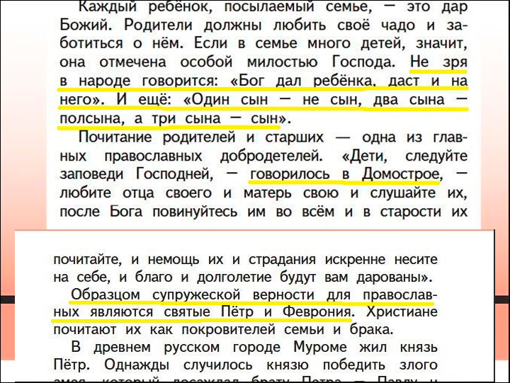 Вот, собственно, и всё, что школьники узнают о семье в Православии. Изложение жития святых — это, конечно, важно, но такой формат сложен для восприятия пятиклассниками.