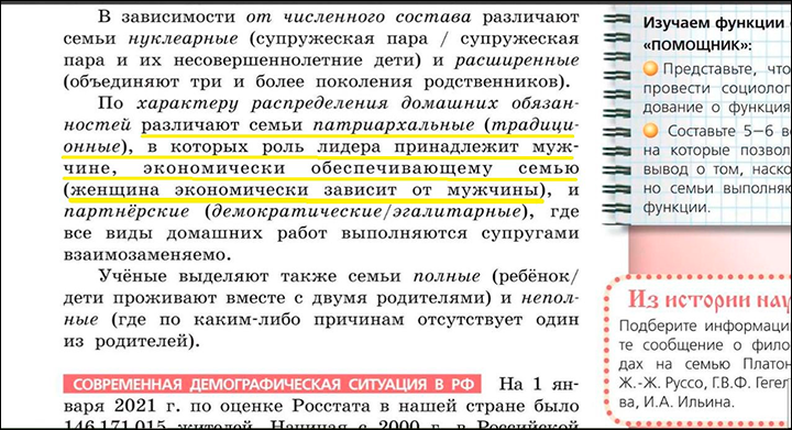И продолжают узнавать из учебника 2022 года выпуска много "интересного" и про изменяющиеся со временем "социальные формы" семьи (уж не на нынешние ли западные извращения в виде "толерантных союзов" тут намёк?), и про феминистское восприятие брака — мол, это разновидность притеснения женщины со стороны мужчины.