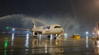 Самолёт новой авиакомпании в воздушной гавани курорта традиционно встретили водяной аркой.